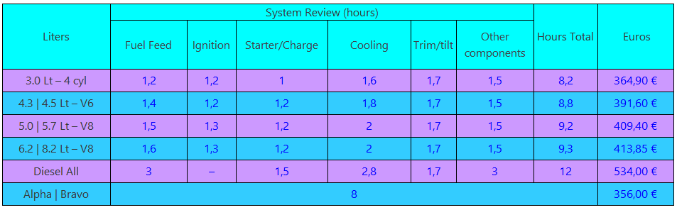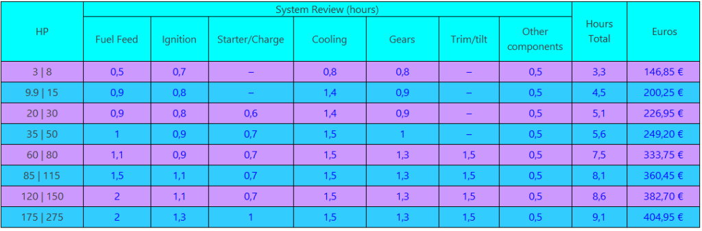 Informative price list for consultation with estimated values for the completion of certain common maintenance tasks on Outboard Engines 2 and 4 strokes and Inboards Engines as well Propulsion Units (Transoms and Drives)